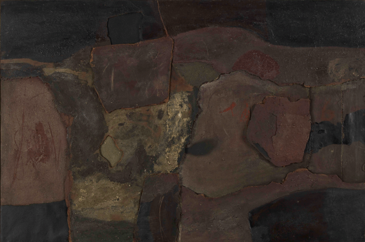 Masonite board, canvas, PVA, sand, pigment, oil paint and tar