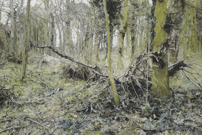 Jerusalem is the overall title and the title of the first work. The four paintings are interpretations of that future which we are living in. The first is titled Jerusalem and is composed of trees and shrubs which have been left to to their own devices. Some have fallen others are in full maturity and others sprouting up out of the disorder.