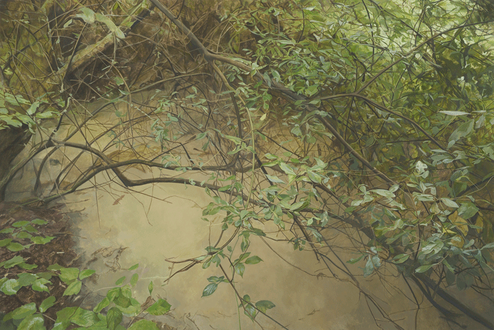 Sink is a reversal of Pit where the viewer looks down into the muddy water of a stagnant pool in a wood. The viewer is enclosed by the shrubbery of small marshy trees. The gaze is directed into opaque muddy water.