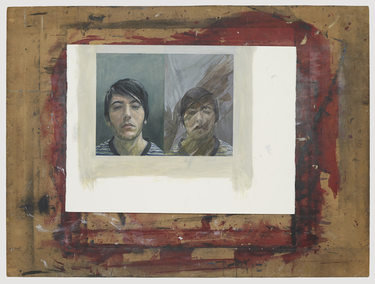 The Guardian article was found lying on the floor after I had cleaned a brush on it which prompted me to think about a possible connection between the subject: the incidental defilement of the image, which connected with the newspaper report. It brought up the question of framing and dividing which is done through choice of imagery - the framing devices in the painting and through the addition of other framings.