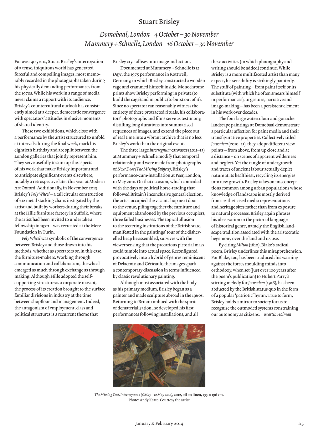 Review of the exhibitions at Mummery+Schnelle and domobaal by Martin Holman, Art Review, January-February 2014